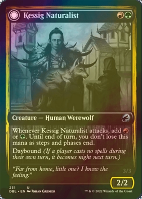 | カードテキスト | ケッシグの自然主義者が攻撃するたび、(赤)か(緑)を加える。ターン終了時まで、このマナはステップやフェイズの終了に際して無くならない。 日暮(プレイヤーが自分のターンに呪文を唱えなかったなら、次のターンに夜になる。) |