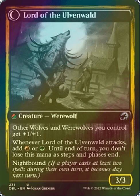 | カードテキスト | あなたがコントロールしていてこれでないすべての狼(Wolf)や狼男(Werewolf)は+1/+1の修整を受ける。 ウルヴェンワルドの王が攻撃するたび、(赤)か(緑)を加える。ターン終了時まで、このマナはステップやフェイズの終了に際して無くならない。 夜明(プレイヤーが自分のターンに2つ以上の呪文を唱えたなら、次のターンに昼になる。) |