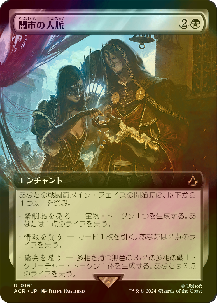 | カードテキスト | あなたの戦闘前メイン・フェイズの開始時に、以下から1つ以上を選ぶ。 ・禁制品を売る ― 宝物(Treasure)トークン1つを生成する。あなたは1点のライフを失う。 ・情報を買う ― カード1枚を引く。あなたは2点のライフを失う。 ・傭兵を雇う ― 多相を持つ無色の3/2の多相の戦士(Shapeshifter)クリーチャー・トークン1体を生成する。あなたは3点のライフを失う。(それはすべてのクリーチャー・タイプを持つ。) |