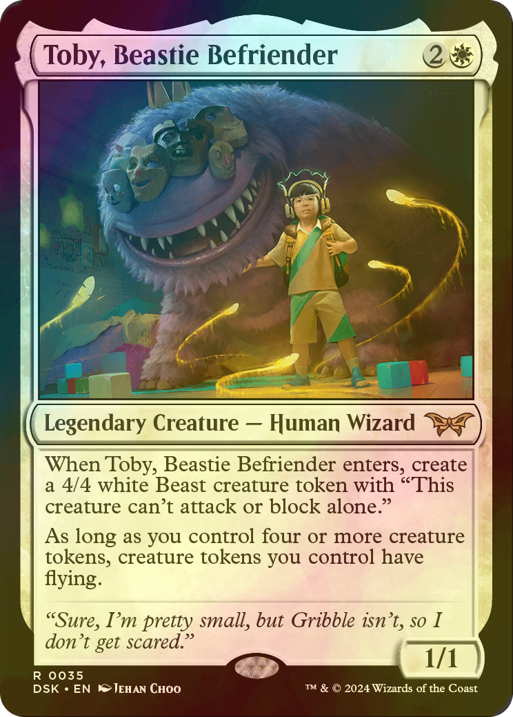 | カードテキスト | けだものの友、トビーが戦場に出たとき、「このクリーチャーは単独では攻撃もブロックもできない。」を持つ白の4/4のビースト(Beast)・クリーチャー・トークン1体を生成する。 あなたが4体以上のクリーチャー・トークンをコントロールしているかぎり、あなたがコントロールしているすべてのクリーチャー・トークンは飛行を持つ。 |