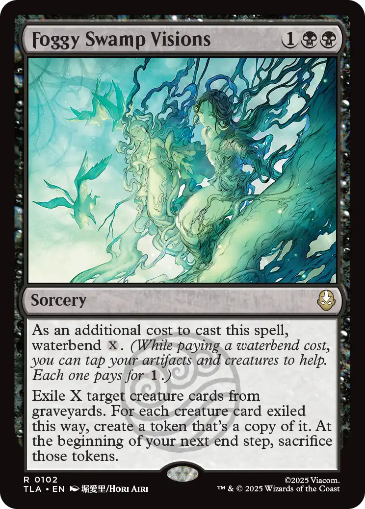 | カードテキスト | この呪文を唱えるための追加コストとして、水の技(X)を行う。(あなたのアーティファクトやクリーチャーをタップすると、水の技コストを支払う助けとなる。1つにつきそれぞれ(1)を支払う。) 墓地にあるクリーチャー・カードX枚を対象とする。それらを追放する。これにより追放されたクリーチャー・カード1枚につき1体の、それのコピーであるトークンを生成する。次のあなたの終了ステップの開始時に、それらのトークンを生け贄に捧げる。 |
